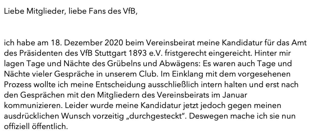 Zudem sehe ich mich in meiner Funktion als Vereinsbeirat als Repräsentant und Vertreter der e.V.-Mitglieder. Dementsprechend ist beispielsweise die 50plus1-Regel mit mitgliederstarken Vereinen als Haupteigentümer von Fußballunternehmen für mich die Grundvoraussetzung nachhaltiger Wettbewerbsentwicklung im deutschen Profifußball. Dafür werde ich mich mit allem, was ich habe, stark machen. Dazu brauche ich allerdings ein starkes Votum der Mitgliederversammlung als höchstem Organ unseres Vereins und werbe daher um das Vertrauen und die Stimmen der Mitglieder unseres VfB Stuttgart 1893 e.V..