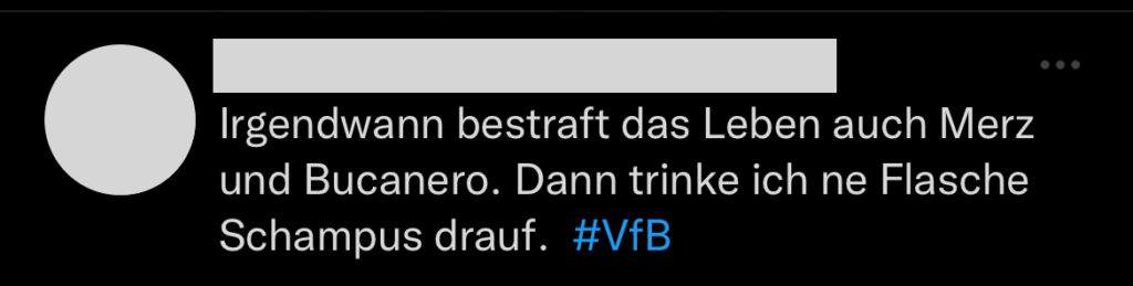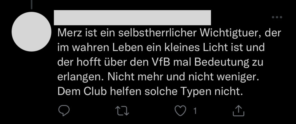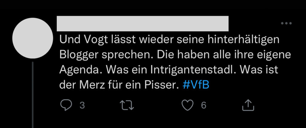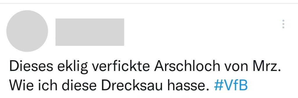 Neben allen mehr oder weniger inhaltlichen Themen gibt es aber noch eine weitere Ebene, die in diesem Jahr deutlich zugenommen hat: Die der persönlichen Beleidigungen und Unterstellungen. Die Liste der Dinge, derer ich im Laufe der Monate bezichtigt wurde, ist lang und reicht von dem Vorwurf, dass ich mich über jede Niederlage der Mannschaft freuen würde (weil es meiner persönlichen Agenda der Übernahme des VfB diene 🤦🏻‍♂️) bis hin zu dem Vorwurf, in unterschiedlicher Art und Weise persönliche Vorteile aus dem VfB ziehen zu wollen. Über manches kann ich aufgrund der Absurdität und Dummheit nur müde lächeln, aber es gibt auch Dinge, die Grenzen deutlich überschreiten und mindestens Beleidigungen, noch öfter aber einfach Hatespeech sind. Beispiele? Bitte sehr, eine kleine Auswahl: